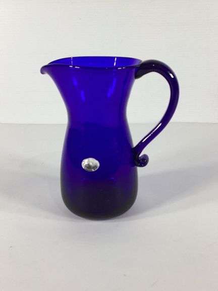 LOT 1068 - Cobalt blue blown glass pitcher, 9 inches tall, signed