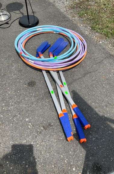 LOT 4654 - Poly nerf hockey sticks, and hula hoops