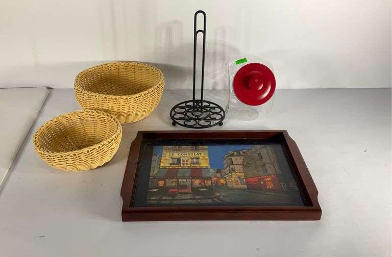 LOT 1191 - Two round small baskets, paper towel holder, plastic jar, and a wooden tray. Seller code V