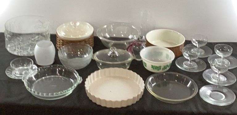 LOT 1895 - Lot of kitchen glasswares. 3 Pyrex oven dishes,sherbet dishes,salad bowls,&more