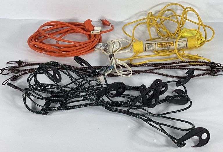 LOT 1229 - Bungee cords, cargo cover, shop light (works) and extension cords