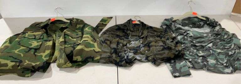 LOT 3047 - Three camouflage pieces of clothing, dress, women’s button up, and women’s jacket, sizes XL and 1X