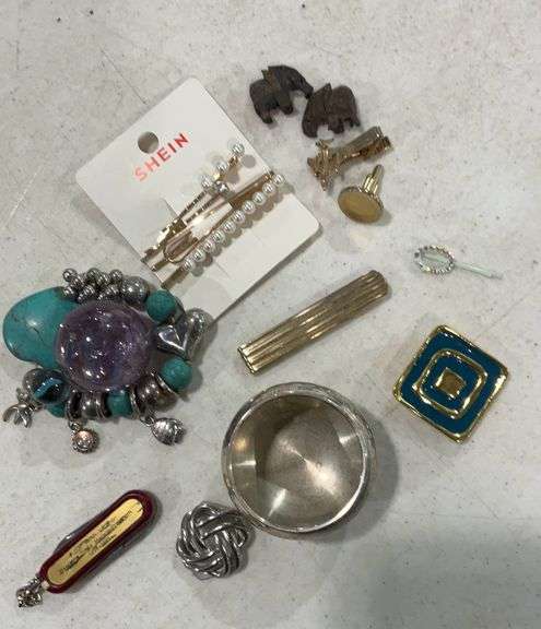 LOT 622 - Pilot tie clip, silver plated cup,turquoise charm bracket and other Knick knacks