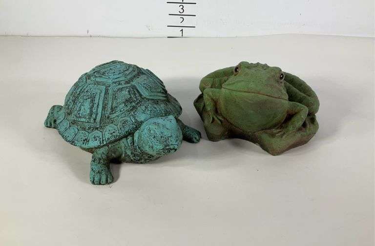 LOT 2601 - Garden decor. Cement frog and resin turtle.