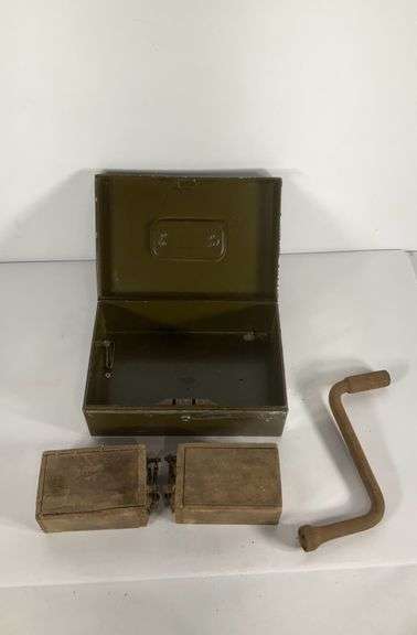 LOT 2754 - Metal lock box with no key. Has two Ford battery’s and a hand crank