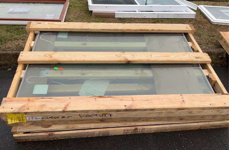 LOT 334 - Double glass pane window, glass only no vinyl frame, 65”x44”, will remain in wood shipping crate