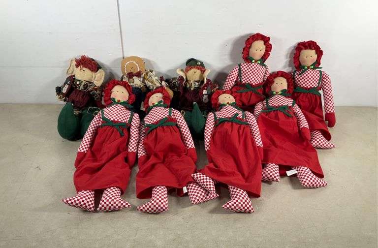 LOT 2025 - Group of rag dolls, Overly Raker and Country Honey Pot, red dolls with hooks on backs