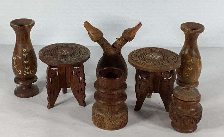 LOT 1078 - Wooden wares, plant stands, candleholders and leather wrapped oil & vinegar bottle (flaking)