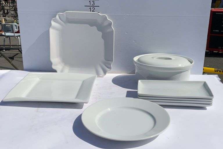 LOT 1213 - Crate&Barrel dishes, scalloped edge dish, oven bake dis with lid, square plate(4)