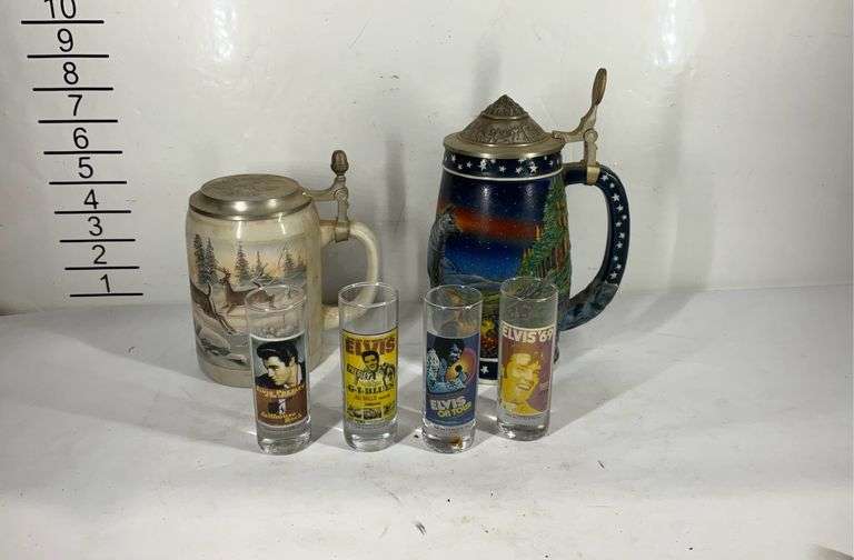 LOT 2351 - Four Elvis Presley shot glasses and two beer steins Domex and a fire in the sky longton crown