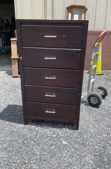 LOT 1346 - Press wood firework dresser, some scuffing on sides from movers. A few of the drawers stick measures 32 inches wide 56 tall 19 inches deep.