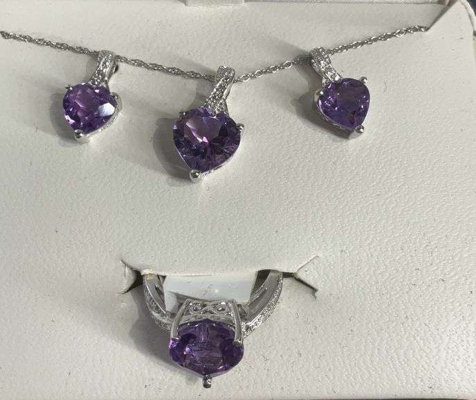 LOT 806 - Sterling silver and amethyst jewelry set with necklace, earrings , and ring size 6.75