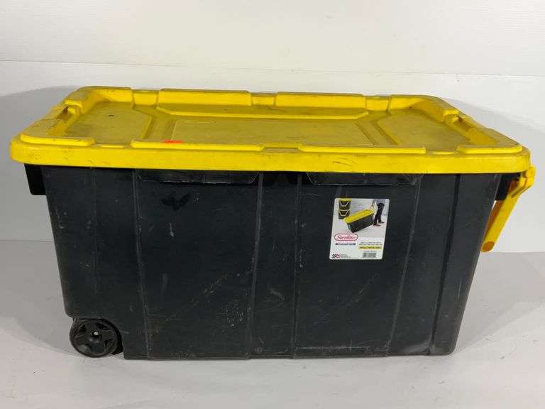 LOT 1586 - Sterilite 40 gallon industrial tote with lid. Has wheels and handle.