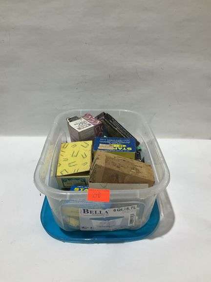 LOT 2885 - 6qt container with lid has staples and other miscellaneous