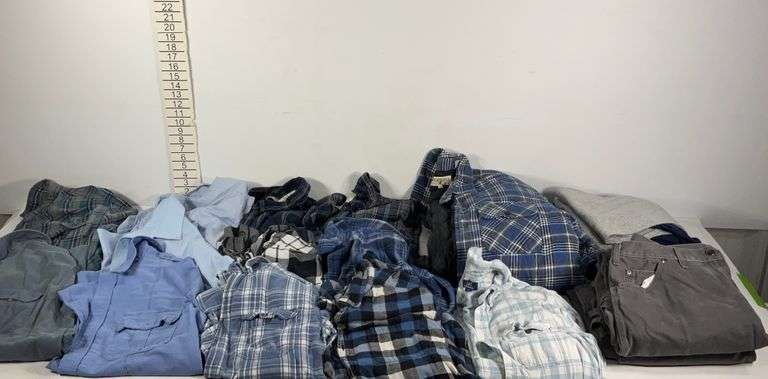 LOT 1675 - Clothes, flannels, dress shirts, t-shirts, flannel jacket, and Dickies jeans