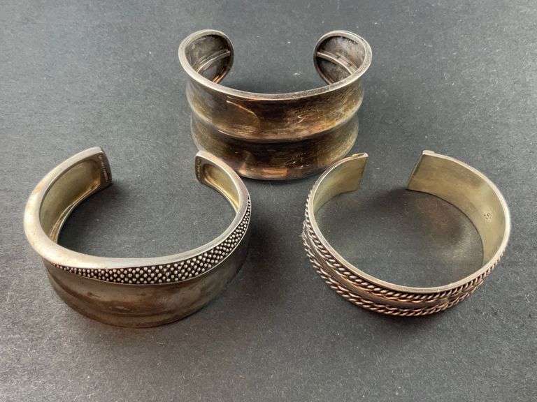 LOT 768 - Three sterling silver cuff bracelet 126.82grams, one marked Michael Dawkins and two Mexico