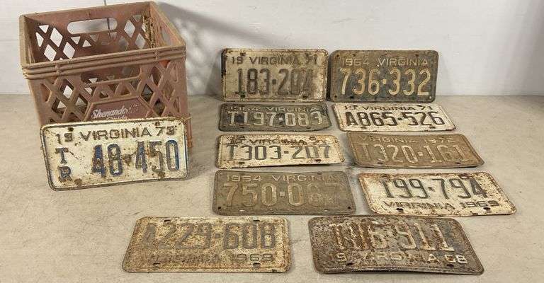 LOT 1527 - Milk crate with Virginia license plates, ‘60s and ‘70s