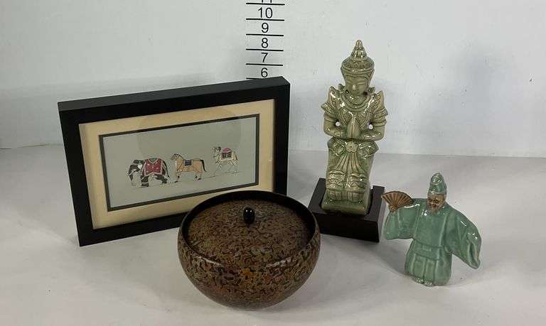 LOT 2311 - Asian themed group. Framed and matted art print, ceramic Buddha statue on wood base, jar and more. Note that the Buddha has been repaired.