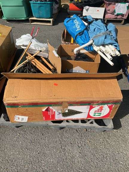 LOT 4514 - Pallet lot,holiday tree with lights, sander, saw blade, etc. etc. pallet will be located outside and covered to the best of our abilities, buyer of pallet takes all contents