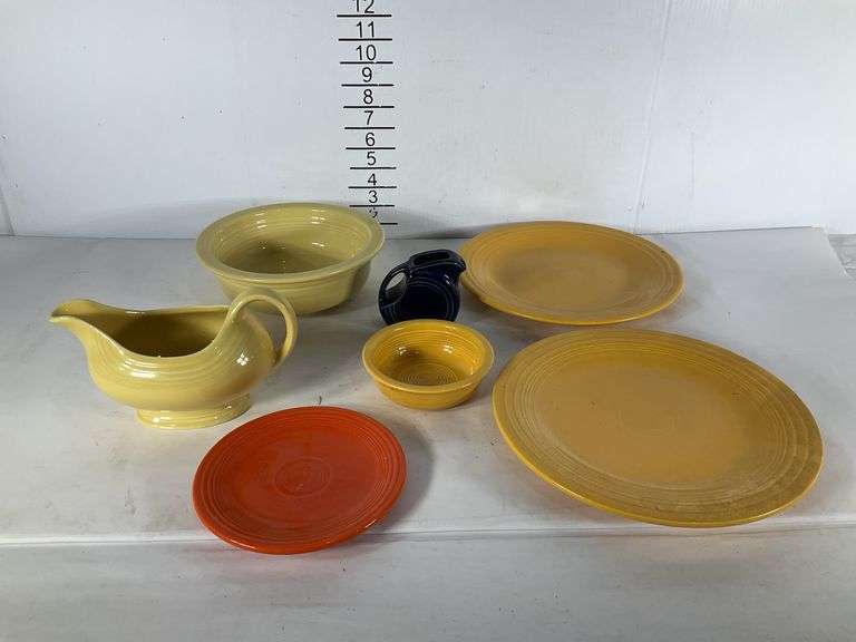 LOT 1506 - Fiesta 10in plate, saucer, creamers, and bowls. Some chipping,
