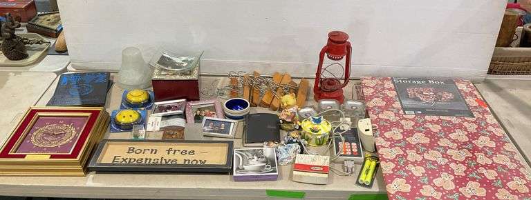 LOT 2111a - Group lot, hangers, cardboard storage boxes (one wet), lantern part, yearbooks, etc.