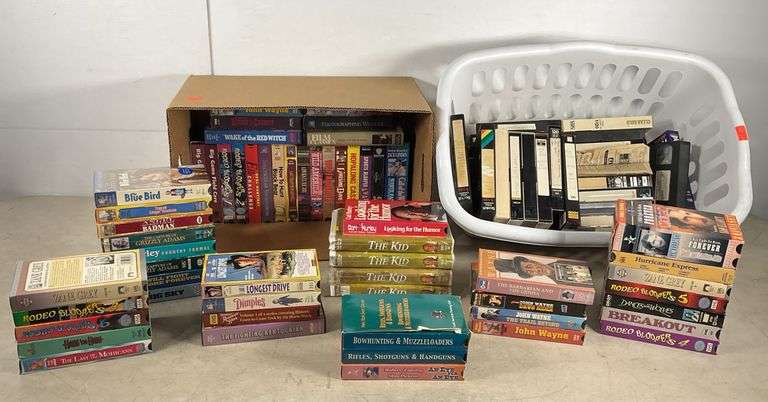 LOT 2030A - Two containers: VHS tapes, rodeo bloopers, John Wayne, Shirley Temple