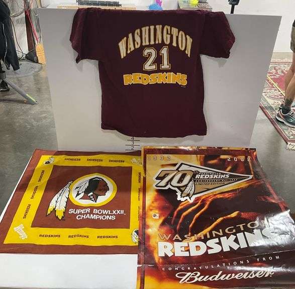LOT 2258 - Washington Redskins size 10/12 child’s shirt (has holes), Wendy’s/ Coca Cola Redskins 20in cloth and a Budweiser Redskins poster.