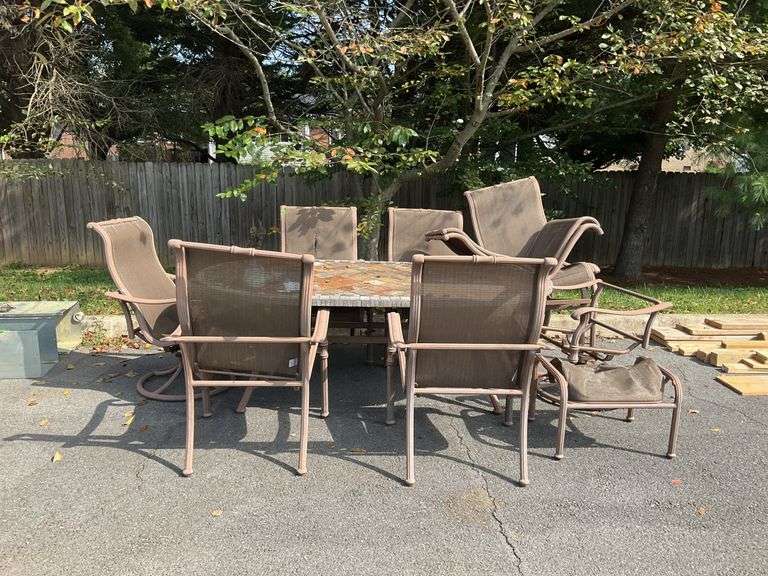 LOT 182 - Natural stone look patio dining table, with two swivel captains chairs, six stationary chairs and an ottoman, the table is 80”L x42”W, there are rips in fabric and assembly is required,