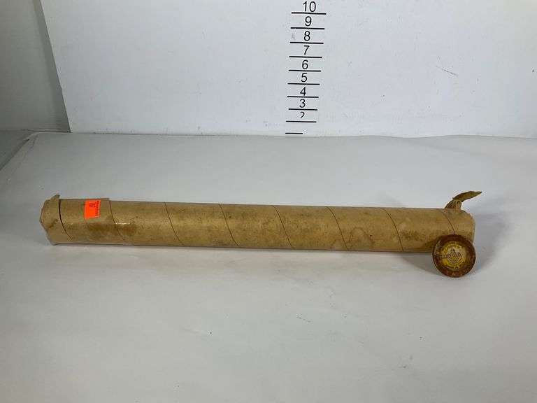 Cardboard cylindrical milk carrier from Willowmere Farms, marked ‘Golden Guernsey Pasteurized Grade A Milk’ and labeled ‘B.F. Salsbury, Ohio.’ The tube features its original paper wrapping and wooden cap with a branded label. Visible wear, tears, and discoloration are present consistent with age and use, as shown in photos.