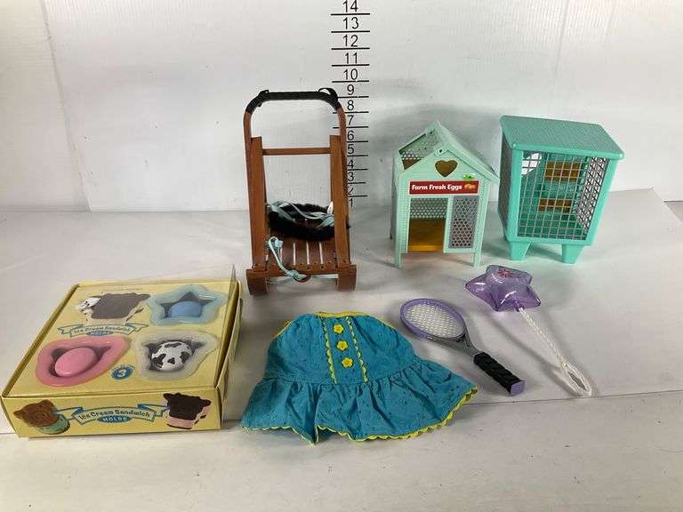 A mixed lot of toys and accessories comprising a set of Williams-Sonoma ice cream sandwich molds in the original box, a sled with harness and black faux-fur seat liner, a turquoise doll dress with yellow trim, a purple plastic star-shaped wand, a toy tennis racket with a purple and black grip, and two plastic toy structures resembling a hen house labeled 'Farm Fresh Eggs' and a fenced cage. Everything Doll sized.