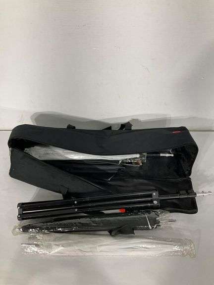 Cowboy Studio photography kit including two collapsible light stands, two white umbrellas (wrapped in plastic), three black umbrellas and a black nylon carry bag. The kit is designed for studio lighting setups and includes adjustable stands with metal fittings. The carry bag has dual handles and a zippered closure for portability. Items appear gently used with wear consistent with handling.