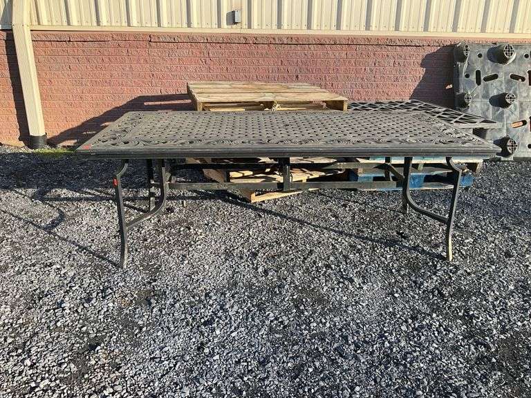 Thomasville outdoor dining table crafted from cast aluminum with intricate lattice and scrollwork detailing on the top surface. Features a rectangular design and measures 80 inches long, 40 inches wide, and 28 inches high. The table includes a central hole for an umbrella and shows outdoor wear consistent with use.
