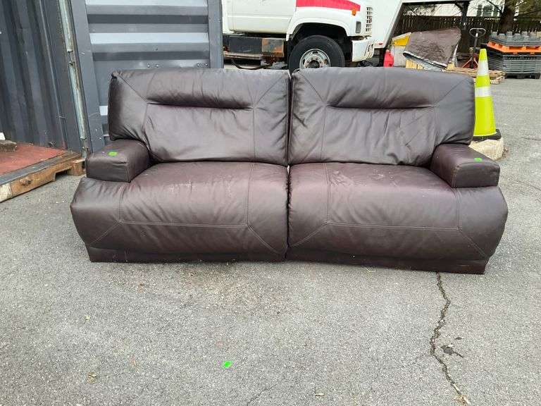 Brown upholstered reclining sofa featuring two seats with padded armrests and backrests. Designed with power recline functionality, though the power supply box is not included. Notable stains and discoloration from prior use are present on the material. Measures approximately 68” in sitting width.