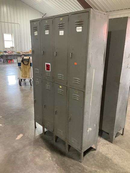 Industrial-style locker unit featuring eight compartments with vented doors, constructed of steel. Designed with elevated legs for easy cleaning and storage efficiency. Functional for storage in various environments.