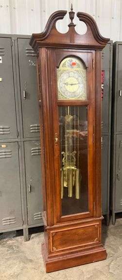 Seth Thomas grandfather clock featuring a brass and silver-tone dial with floral accents and moon phase display. Includes pendulum, weight-driven movement, and glass-paneled door. Stands 83”H and comes with a key. Functionality is unknown.