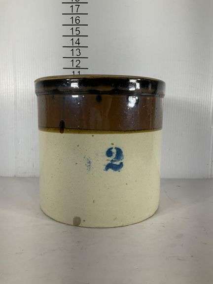 Stoneware crock featuring a brown glazed upper portion and an unglazed cream-colored lower portion. Blue ‘2’ marking on the front. Interior with dark brown glaze. Suitable for decorative use or storage.