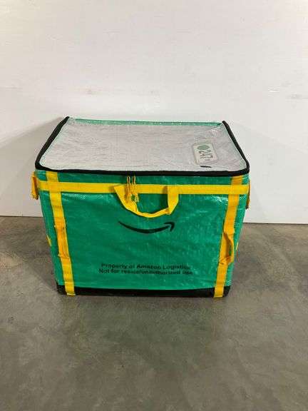 Large green and yellow collapsible logistics delivery bag with multiple handles and zippered closure. Made from durable synthetic materials. Folds flat for convenient storage.