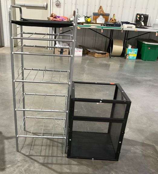 Includes one mesh storage cube in a metal framework and one six-tier wire shelving unit with a cloth top surface. The shelf and cube offer functional storage solutions suitable for various organizational needs.