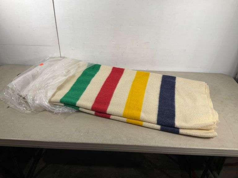 Hudson's Bay Point Blanket made of 100% wool, featuring green, red, yellow, and navy stripes on a cream background. Includes original label indicating product origin and material.