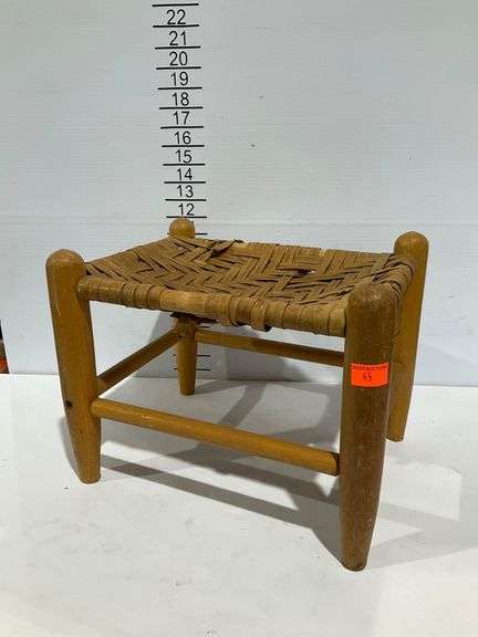 Stool featuring a woven seat in a herringbone pattern supported by a rounded frame with cylindrical legs and stretcher bars. The seat shows visible wear and breaks in the weaving. Designed for use as a functional or decorative piece.