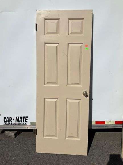 Beige interior door featuring a classic six-panel design and brass-tone doorknob assembly. Hinge hardware is partially attached. Measuring 80 inches in height and 30 inches in width.
