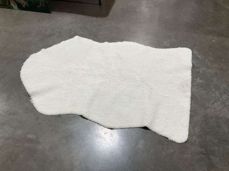 White shag rug featuring a soft textured pile with a non-slip backing. Dimensions measure 57×34”. Constructed for use on hard floors, with backing shown in a beige tone.