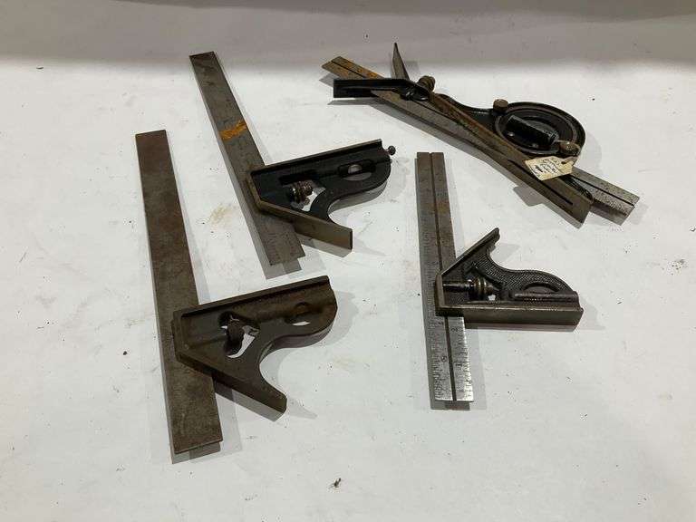 Includes multiple combination squares with metal rulers, angle finders, and leveling attachments. The lot features different sizes and configurations of tools designed for precision measurement and marking tasks.