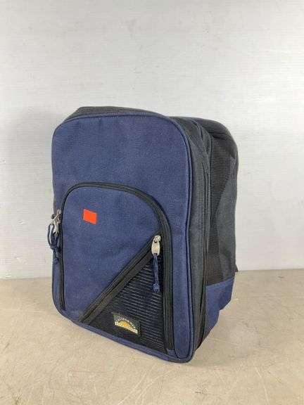 California Innovations backpack picnic set in blue featuring multiple zippered compartments. Includes picnic accessories such as utensils, napkins, and glasses secured inside the main compartment. Adjustable shoulder straps and side panels enhance functionality.