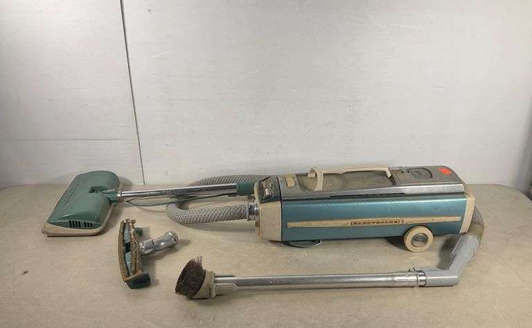 Electrolux canister vacuum cleaner in a blue and beige finish, featuring a flexible hose, two extension wands, a powerhead, and additional brush attachments. Includes a two-prong power cord. Known details indicate the item is not tested.