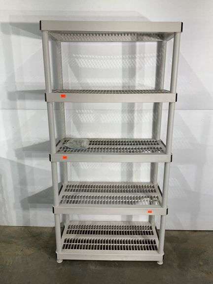 Freestanding shelving unit with four slatted shelves and vertical supports in gray plastic. Features an approximate height of 73 inches. Functional design suitable for storage or organization in various spaces.