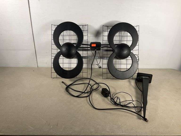 Pair of antennas including a Channel Master outdoor antenna with circular elements and grid backing, and a Recoton FM90 tabletop antenna. Includes power adapter and cables as shown. Both units feature necessary connection fittings for installation.