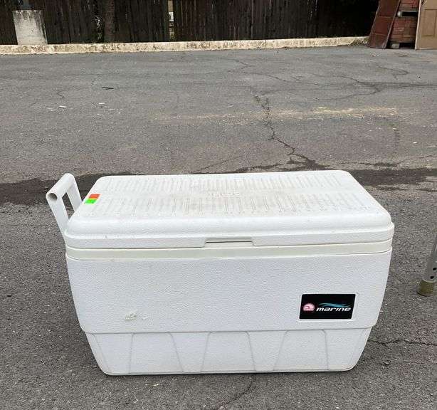 Igloo cooler featuring a durable plastic construction and hinged lid. Designed with integrated side handles, one of which is missing. Spacious interior suitable for storage and transport of items. Exterior shows standard utilitarian design.