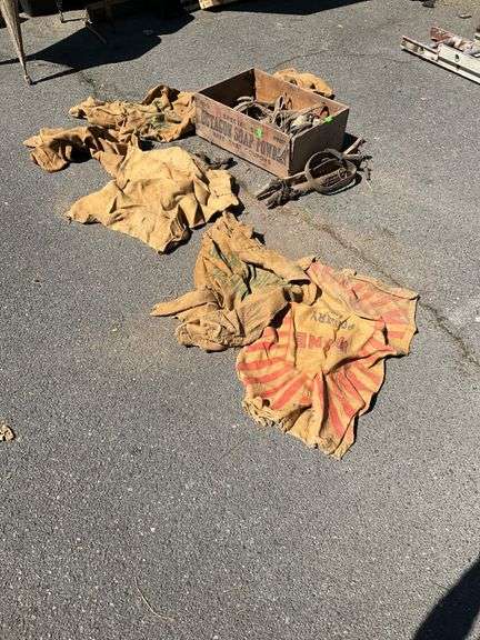 Includes burlap sacks with printed designs, some noted to have holes, horse tack components such as straps and equipment, and a weathered wooden crate labeled with text. Items are from Pope Estate Property. Items condition will vary