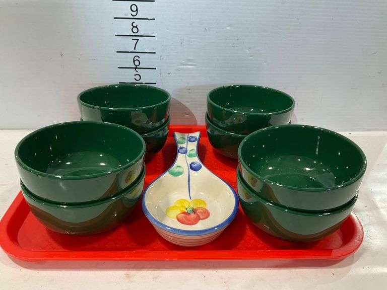 Includes 8 green bowls marked Waechtersbach, made in Germany, along with a ceramic hand-painted spoon rest featuring a floral design. Vibrant hand-painted details on the ladle add a colorful element. Tray shown in the image is not included.